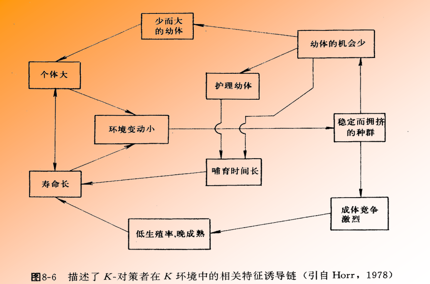 r-对策者和K-对策者是两个进化方向不同的类型,在这中间还有一系列过渡的类型,有的更接近于r-对策者,有的更接近于K-对策者,也就是说从典型的r-对策者到典型的K-对策者之间有一个连续的谱系。