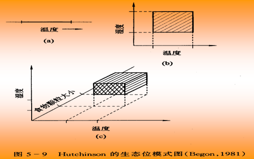 竞争种类越多,使某物种占有的实际生态位可能越来越小。Hutchnson提出的生态位内容相当完整,但要了解生物所需的全部条件是件难事,因此,在操作上,不妨以Elton的生态位即生物的功能地位或“职业”的观点为基础,选择生物所需条件中的几个可量因素去研究生态位的问题。如决定一个水生物种正常繁殖的各种环境变量包括:温度、溶氧、盐度、pH、水流以及食物的种类、大小和组成等因素,物种对这些因素的适宜范围综合构成物种能够栖息生存的多维(变量)空间,即生态位。