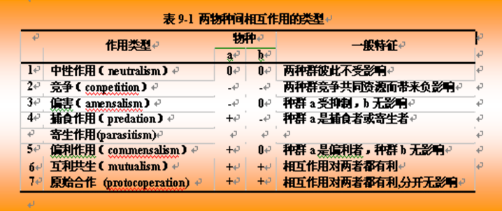 下表两物种之间相互作用的基本类型。表中“+”表示对存活或其他种群特征有益;“-”表示对种群增长或其他特征有抑制;而“0”表示无关紧要的、没有意义的相互影响。
