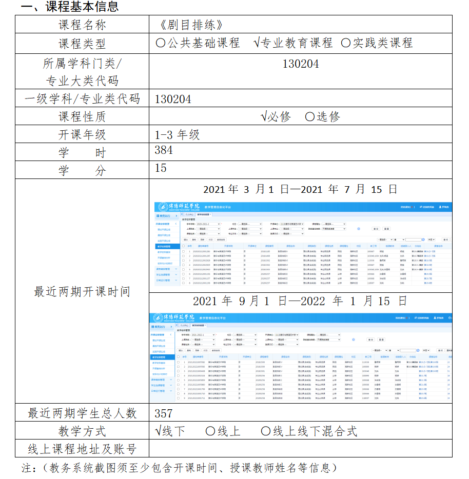 《剧目排练》这门课程是是舞蹈表演专业的必修课,本课程以集体授课和分别指导方式进行。舞蹈剧目课通过表演元素的练习及剧目的排练,培养学生舞蹈表演的兴趣和能力,让学生通过剧目作品的学习掌握舞蹈表演的基本方法、技能及剧目排练的流程。
