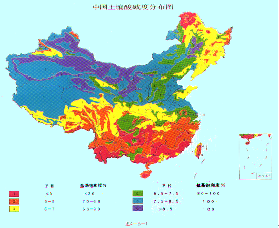 中国土壤,大多数在pH4.5~8.5之间,在地理分布上有“东南酸西北碱”的规律性。大致可以长江为界,长江以南的土壤为酸性或强酸性,长江以北的土壤多为中性或碱性。我国土壤的酸碱性南北差异很大,如吉林、内蒙古、华北的碱土pH值有的高达10.5,而广东省鼎湖山、海南五指山的黄壤,pH值有的低至3.6~3.8。