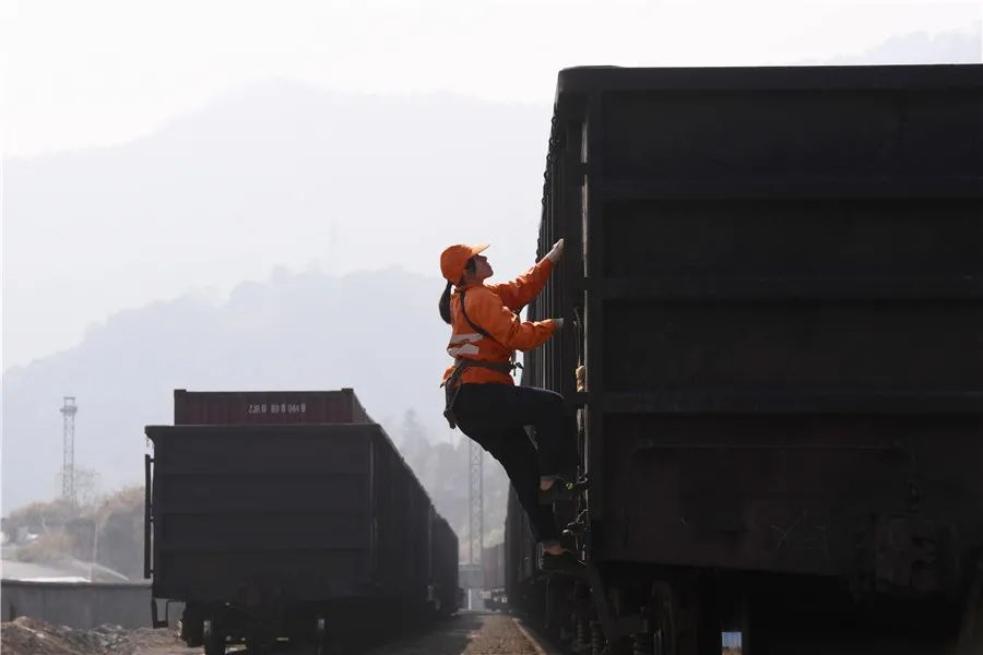 Qiu Lirong climbs a carriage during a coupling task. [Xinhua/Jiang Kehong]