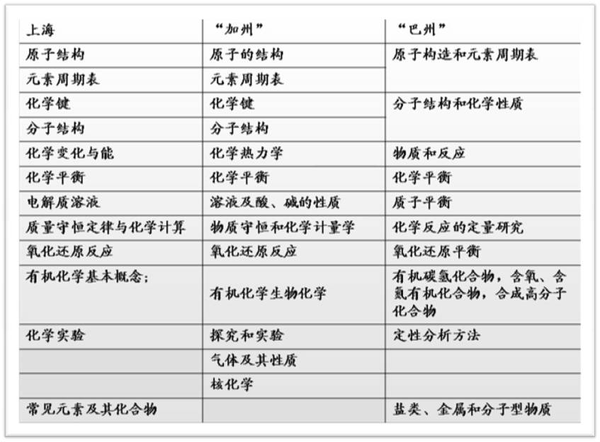 ● 表1:上海市、“加州”与“巴州”化学核心知识比较