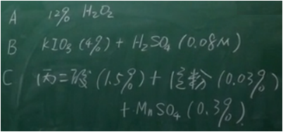 ❤ 配制三种溶液A液:12% H2O2 B液:4% KIO3 ,0.8M H2SO4 C液:1.5%丙二酸CH2(COOH)2 ,0.3%MnSO4,0.03%淀粉