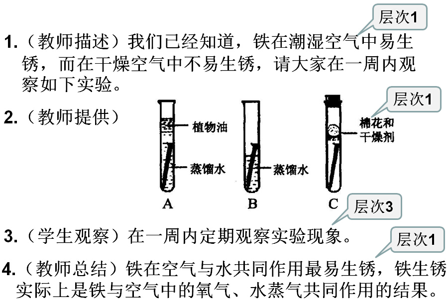 1.(教师描述)我们已经知道,铁在潮湿空气中易生锈,而在干燥空气中不易生锈,请大家在一周内观察如下实验。