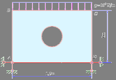 如图所示长方形板ABCD,板厚0.04m,孔半径r=0.2m,E=210GPa,泊松比μ=0.3,约束条件:在长方形底边AD约束全部自由度, BC边施加垂直向下均布载荷g=10000000N/m。用ANSYS或ABAQUS求解其应力情况
