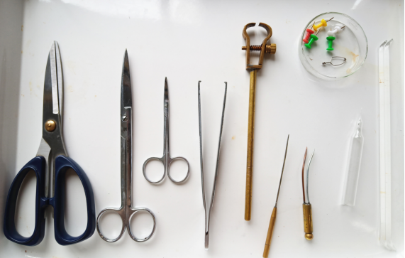 蛙类实验常用的手术器械包括:粗剪刀、手术剪、眼科剪;手术镊;毁髓针;玻璃分针;蛙板; 蛙心夹;蛙嘴夹;蛙心插管;蛙脚钉;锌铜弓等。