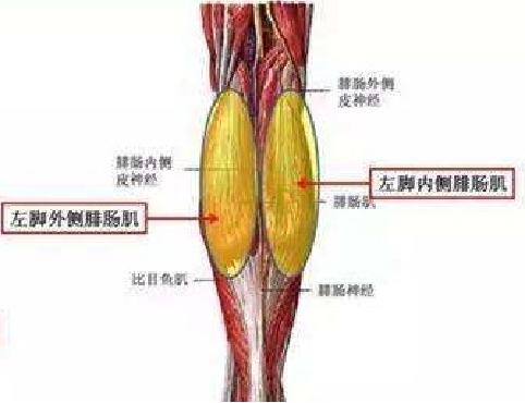 小腿后面浅层的大块肌肉,俗称小腿肚子。肌肉的下端形成坚韧的跟踺连结跟骨。
