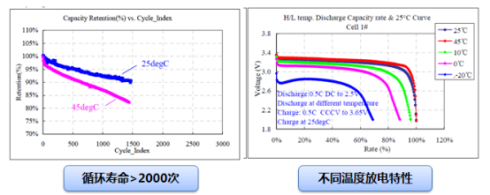 图 磷酸铁锂电池循环寿命和不同温度放电特性