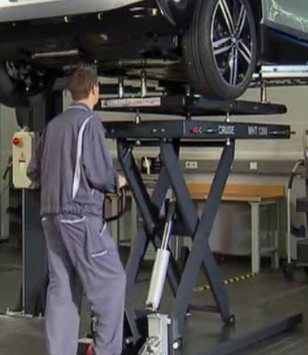 第八步 举升电池升降平台紧贴动力电池底部,拆下动力电池固定螺栓。