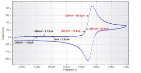 [7] 记录纳米PB修饰玻璃碳电极在未知K+溶液的线性扫描曲线,读出其中的峰电位值,并代入标准曲线,确定未知溶液中K+的浓度。