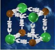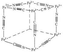 值得一提的是,在水溶液中,黄血盐与Fe3+,赤血盐与Fe2+反应都生成狼色的沉淀,分别称为PB和TB,过去都被用作蓝色染料。所对应的两个显色反应也常被用于Fe3+和Fe2+的鉴别。现代X射线衍射的晶体结构分析证明,二者是同一种物质,不仅具有完全相同的化学组成,其结构也完全相同:Fe3+和Fe2+分别占据顶点、−C≡N−占据棱边。其中,N原子与Fe(III)键连、C原子与Fe(II)键连,K+则间隔的填隙于立方体中心。K+充填饱和时K : Fe : (CN)的化学计量比为1 :2 : 6。鉴于PB中存在价态不同的铁离子,视其为一种同素异价化合物。