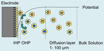 峰的形成(如图):在电位向负扫描的过程中,电极表面氧化态物质初始被还原,形成阴极电流,随着电位的负移,电流迅速增加;当电极表面氧化态物质浓度接近0时,电流达到峰值;随后由于浓度梯度的形成、扩散层厚度的增加,在溶液本体的电活性物质向电极表面扩散传质的速率远远赶不上电极反应的电子传递速率,导致电极表面电活性物质来不及补充,出现“贫乏效应”,电流减小,从而形成一个还原峰。由此可读取峰电位和峰电流。