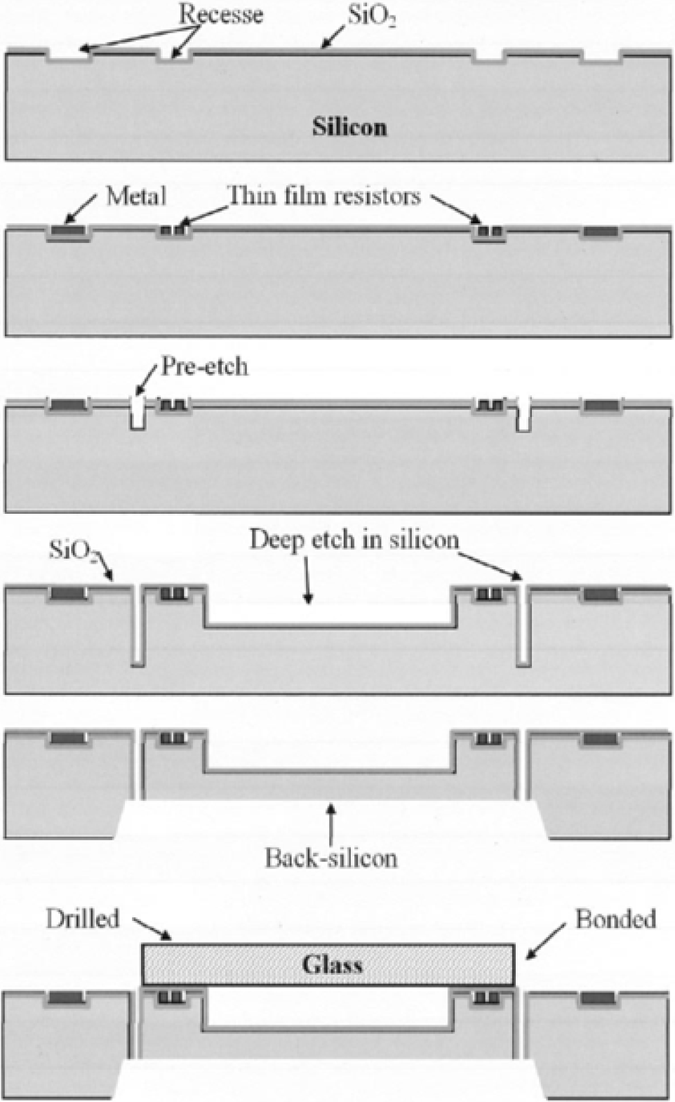 The wafer fabrication uses micromachined silicon, ultrasonically drilled Pyrex glass, and anodic bonding of the two wafers. Metal (Al) heaters and sensors are located on silicon wafer in recessed areas to avoid metal step in bonding. The process flow of the silicon wafer is shown in the figure.