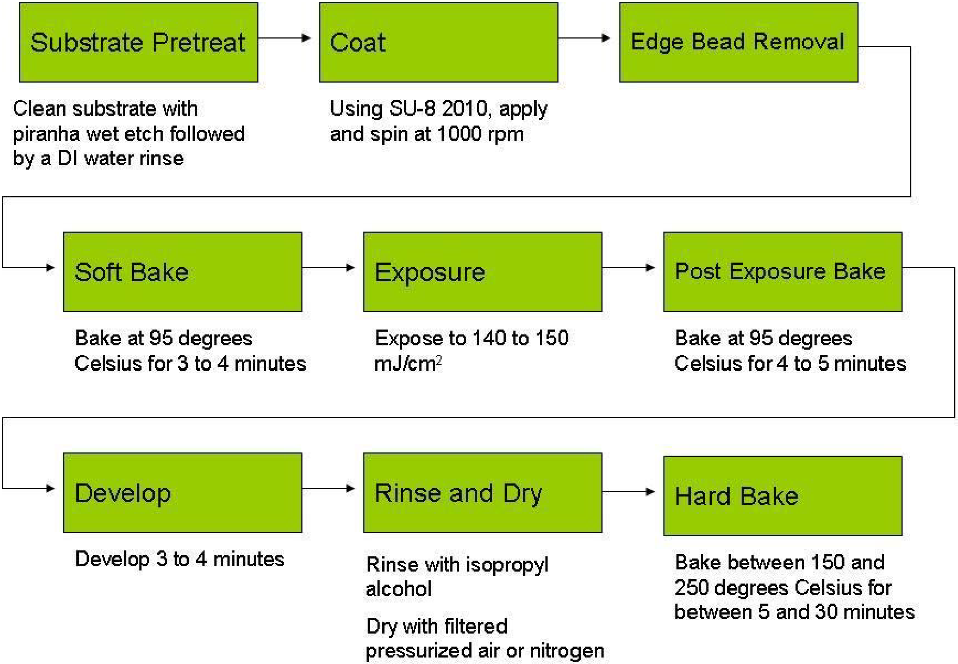 Pay attention to all the process parameters (how long is the piranha wet etch; what is the exposure time for a given UV exposure system). These parameters may not be given in the data sheet and depend on where you are going to perform the photolithography steps. You will need these parameters for “debugging” if the process goes wrong. The following are 2 protocols developed by your fellow classmates.
