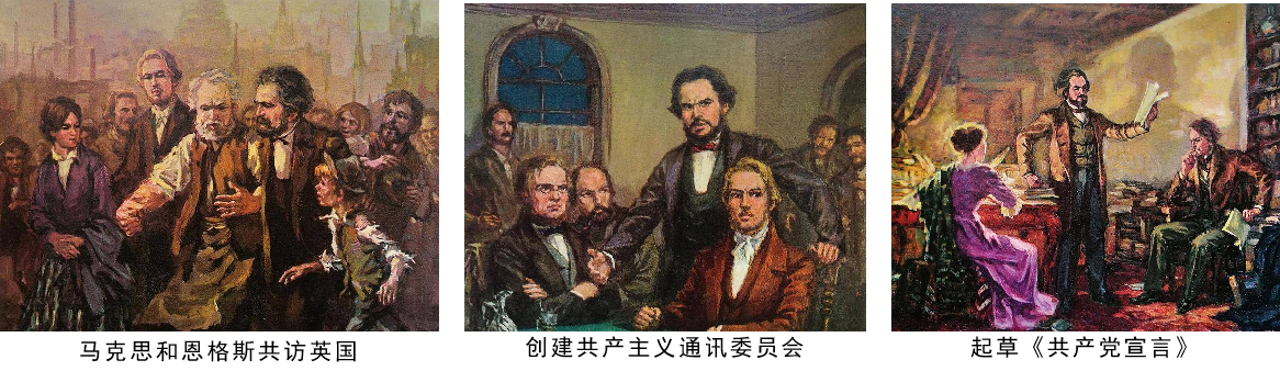 1844年8月底,马克思和恩格斯在巴黎会面,从此开始了毕生的合作,二人合写的《德意志意识形态》首次系统阐述了历史唯物主义的基本观点,实现了历史观上的伟大变革。他们为国际性工人组织“正义者同盟”起草了世界上第一个无产阶级政党的党纲——《共产党宣言》。1848年2月,《共产党宣言》发表,标志着马克思主义的公开问世。