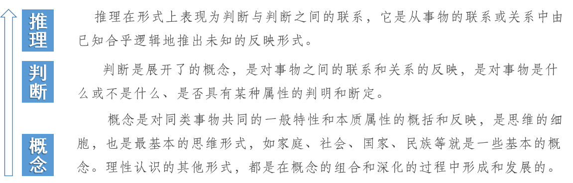 理性认识:理性认识是指人们借助抽象思维,在概括整理大量感性材料的基础上,达到关于事物的本质、全体、内部联系和事物自身规律性的认识。从概念到判断再到推理,是理性认识由低级到髙级的发展。人们在社会实践中形成概念、作出判断、进行推理,表现为一系列的抽象概括、分析和综合,所以这个阶段就是抽象的思维阶段。理性认识具有抽象性和间接性的特点,以反映事物的本质为内容,因而是深刻的。