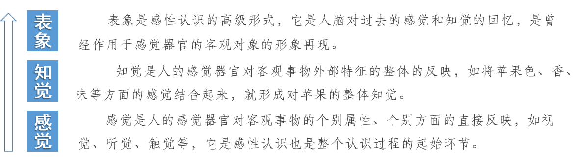 感性认识:感性认识是人们在实践基础上,由感觉器官直接感受到的关于事物的现象、事物的外部联系、事物的各个方面的认识。感性认识是认识的初级阶段,用具体的、生动的形象直接反映外部世界,以事物的现象即外部联系为内容,还没有深入到对事物本质的认识,具有不深刻的局限性,必须进一步上升到理性认识。从感觉、知觉到表象,是由个别的特性到完整的形象,由当时的感知到印象的直接保留和事后回忆的认识过程,已经包含认识由部分到全体、由直接到间接的趋势。
