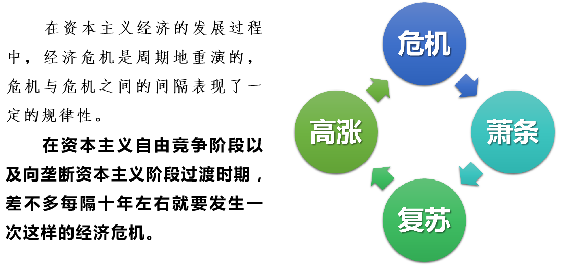资本主义经济危机周期性爆发的特点,使社会资本再生产也呈现出周期性的特点,从一次危机开始到另一次危机的爆发,就是再生产的一个周期。社会资本再生产的周期一般包括四个阶段,即危机、萧条、复苏和高涨。这四个阶段是相互联系的,其中危机阶段是周期的基本阶段。资本主义的再生产不一定都经过四个阶段,但是危机阶段是必经阶段,没有危机阶段,就不存在资本主义再生产的周期性。