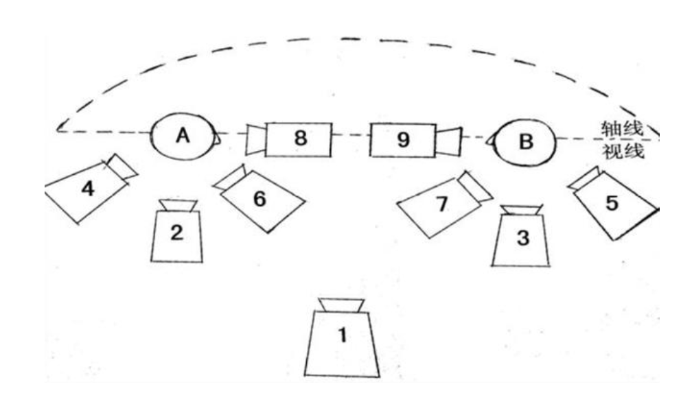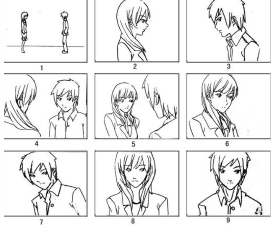 1关系镜头。2、3 人物中景。4、5 局部关系镜头,过肩镜头。6、7 正反打镜头。8、9 骑轴镜头。