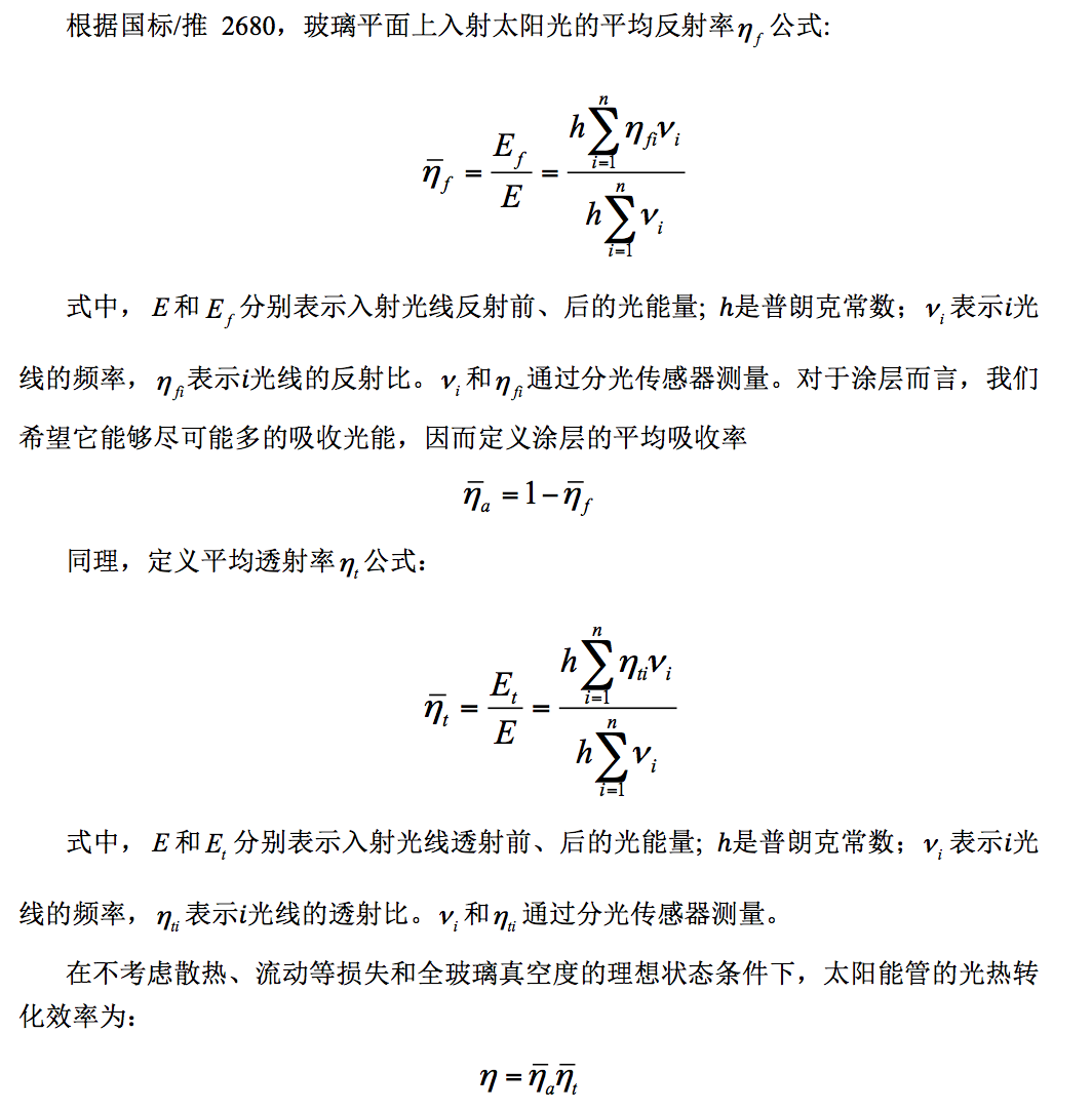 全玻璃真空太阳集热管内选择性吸收涂层的发射比是个非常重要的光-热性能参数,也是生产厂家保证真空管质量的重要依据。按《全玻璃真空太阳集热管》国家标准GBT17049-2005条规定太阳选择性吸收涂层的半球发射比εh≤0.08(水温度为80℃)。本实验采用TRM-FS1型太阳集热管半球发射比测试仪,该仪器采用了计算机与自动化控制技术,具有测试精度高,使用简单,性能稳定,是目前国内最为先进的真空管半球发射比测试仪器。