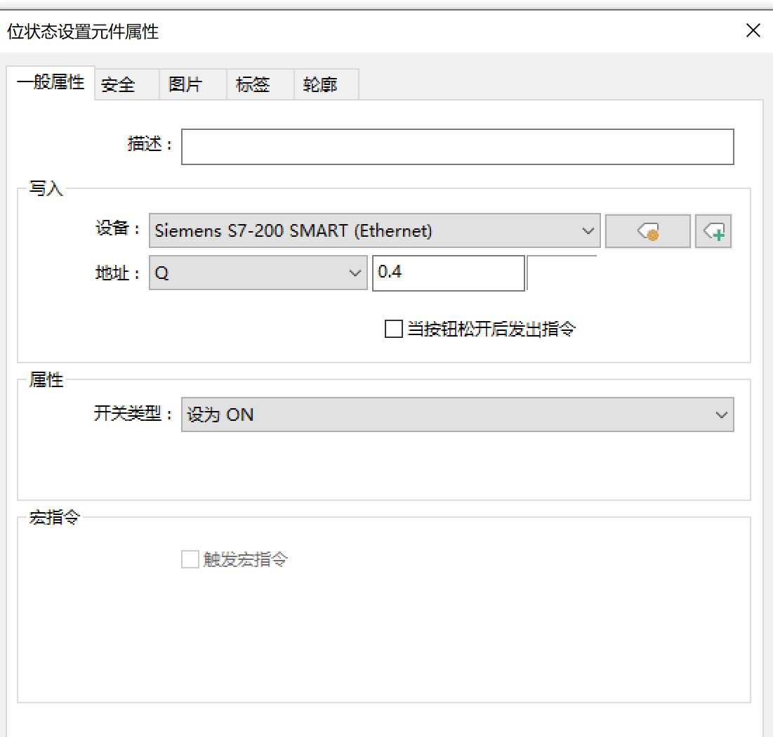 首先制作第一个按钮:一号工位缩回按钮(对应PLC地址为Q0.4),设置如下图所示