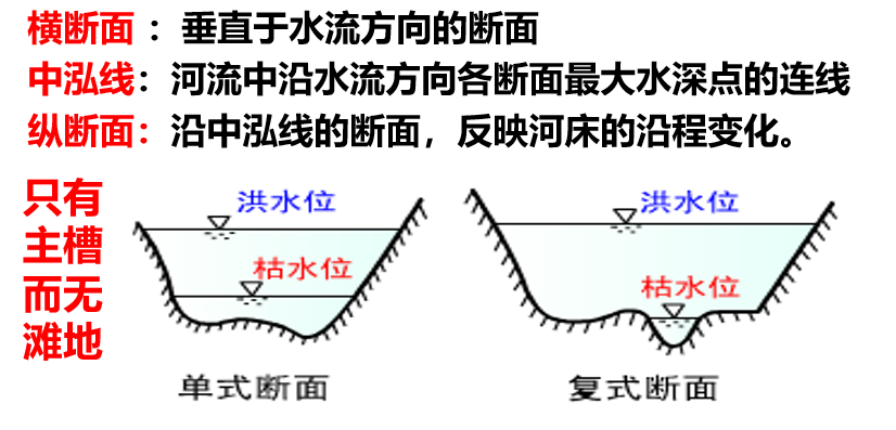 对一个完整的流域而言,依据水流的流动方向从上至下,可将干流分为五段:河源、上游、中游、下游和河口。河源是河流的发源区,多为冰川、湖泊、沼泽等;上游多位于深山峡谷,河槽呈V形,河床比降大,水流湍急,冲刷作用强,常发育急滩和瀑布;中游河床比降变缓,流速减慢,河槽多成U形,河床比较稳定,冲淤作用不明显;下游一般位于平原区,河床比降很小,流速缓慢,水量大,泥沙淤积作用明显,多浅滩和河湾;河口是河流与海洋或者湖泊交接的地方,流速瞬间降低,泥沙沉积,多发育河口三角洲。一个流域的河流长度通常指干流在水平面上的投影长度。