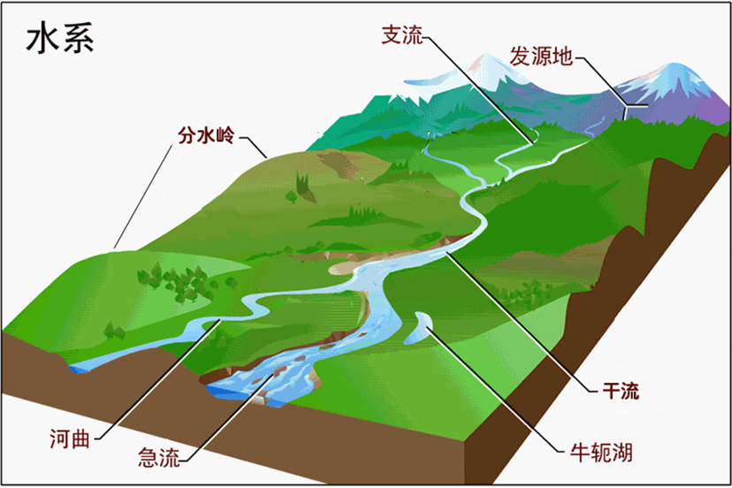 地表集水线——山谷汇集降雨,沿山谷地形低处的连线就是集水线。集水线的高程总是比其两边要低,两边的降雨总是能够汇集到沿集水线的凹槽中,雨水沿集水线地表不断汇入,并向地形低处流动,最终形成河流。