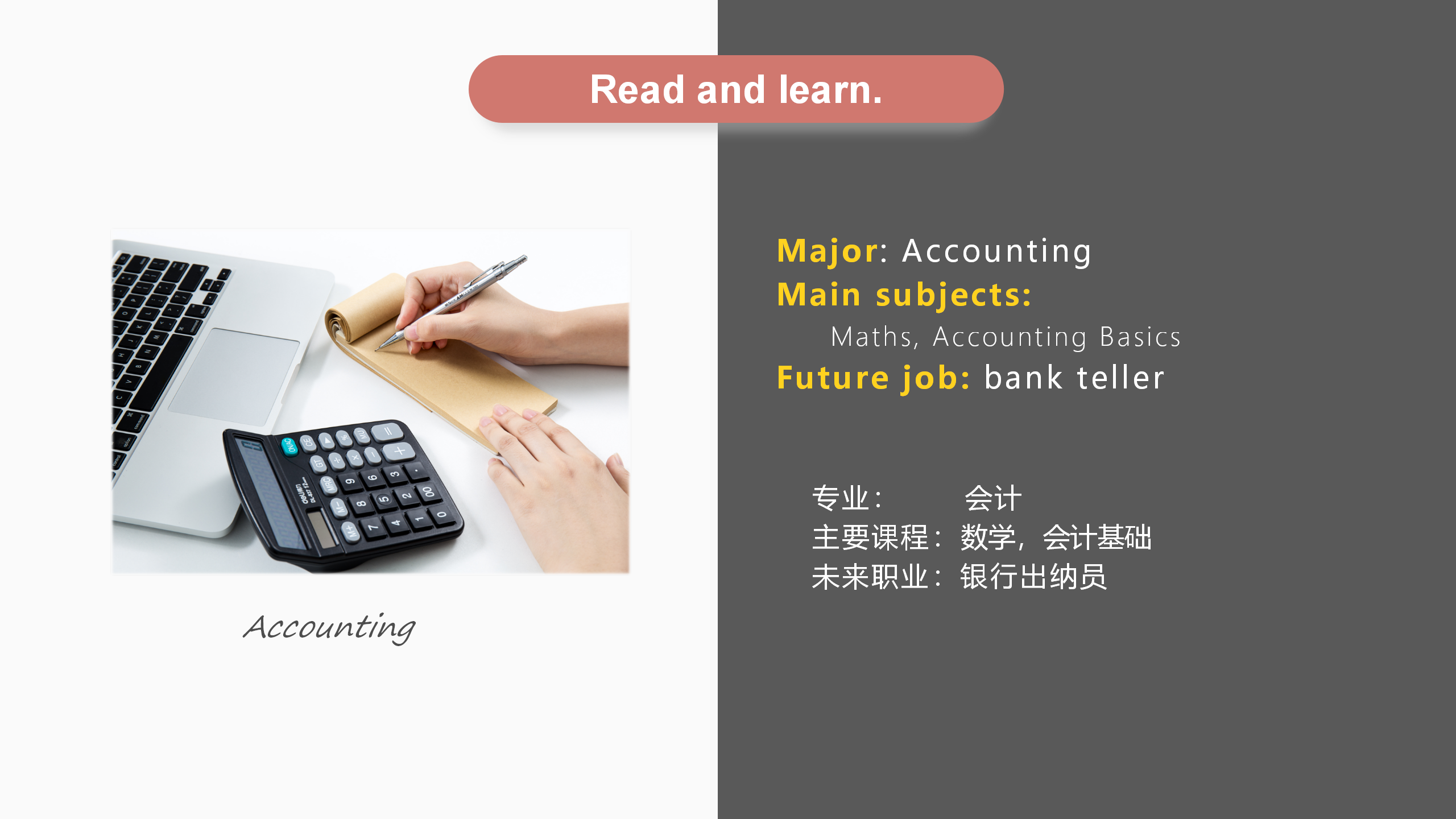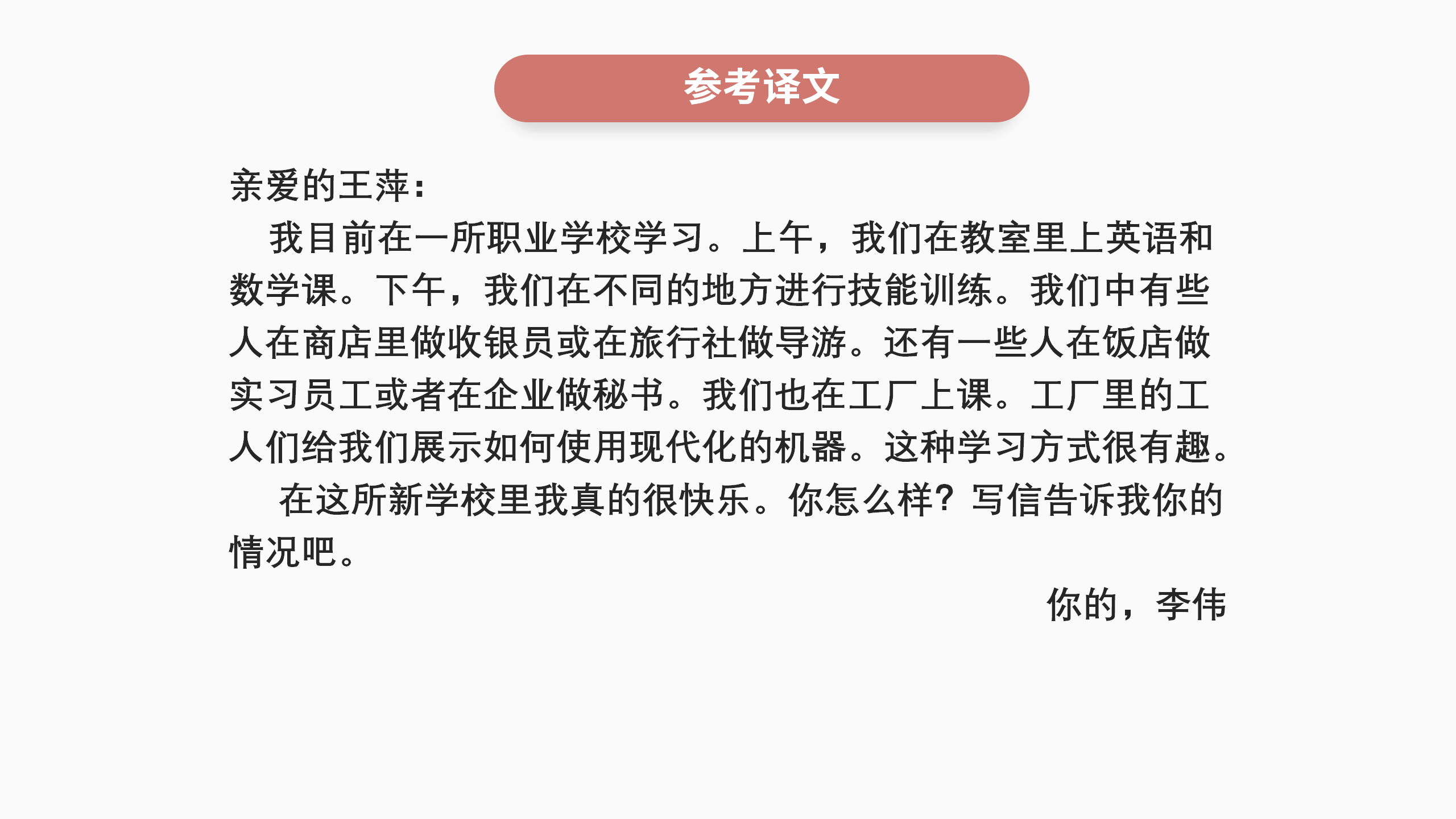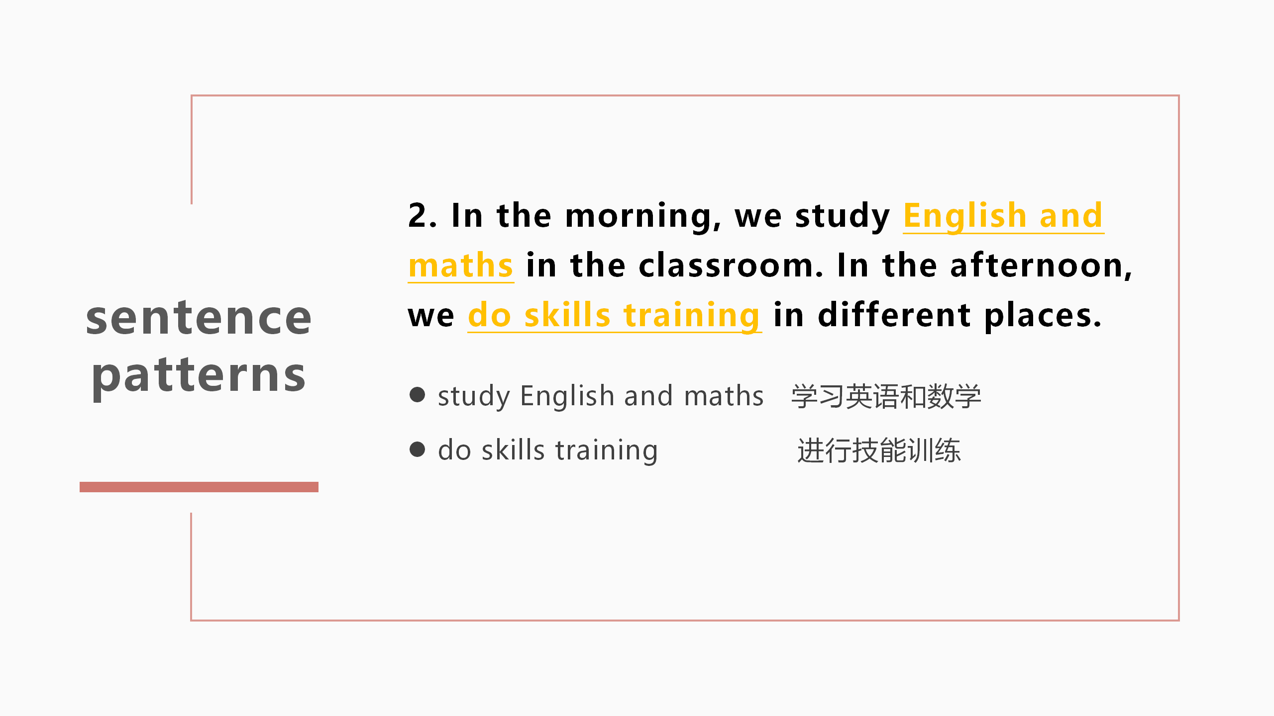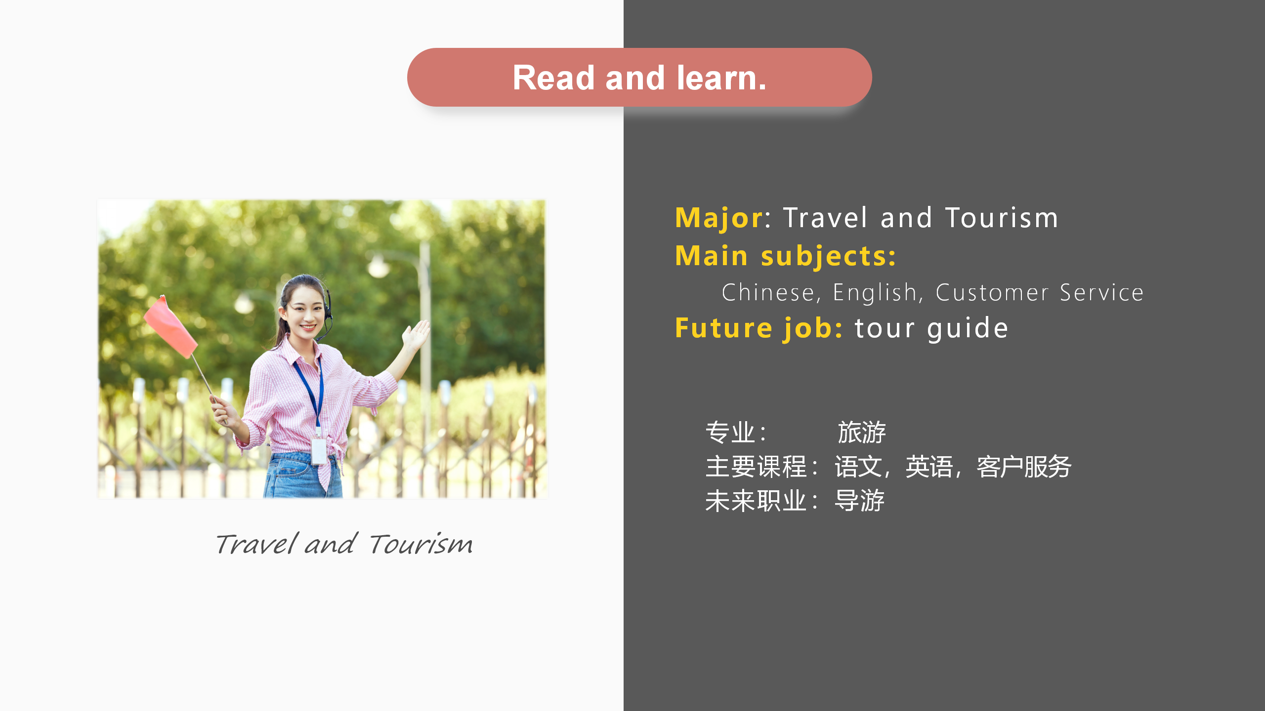 I am studying at a vocational school now. In the morning, we study English and maths in the classroom. In the afternoon, we do skills training in different places. Some of us work as cashiers in shops or as tour guides for travel agencies. Some work as hotel staff or as secretaries in companies. We also have classes in factories. The workers there show us how to use the modern machines. It’s quite interesting.