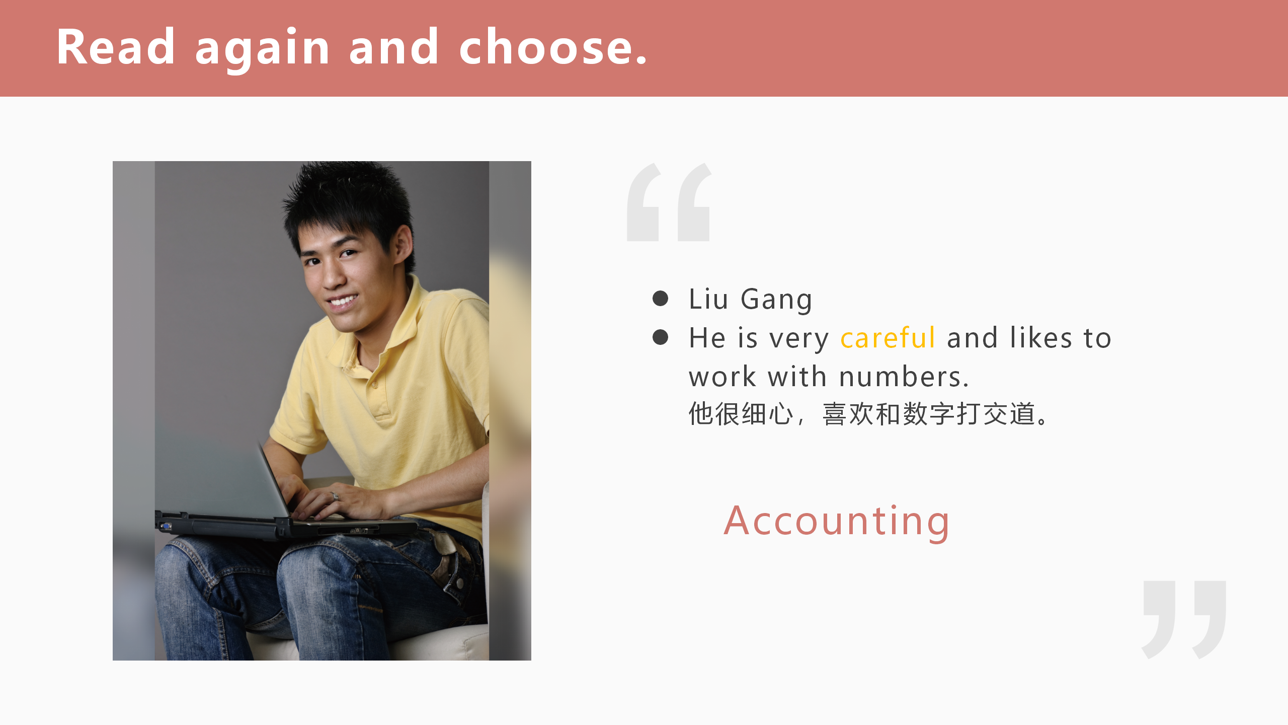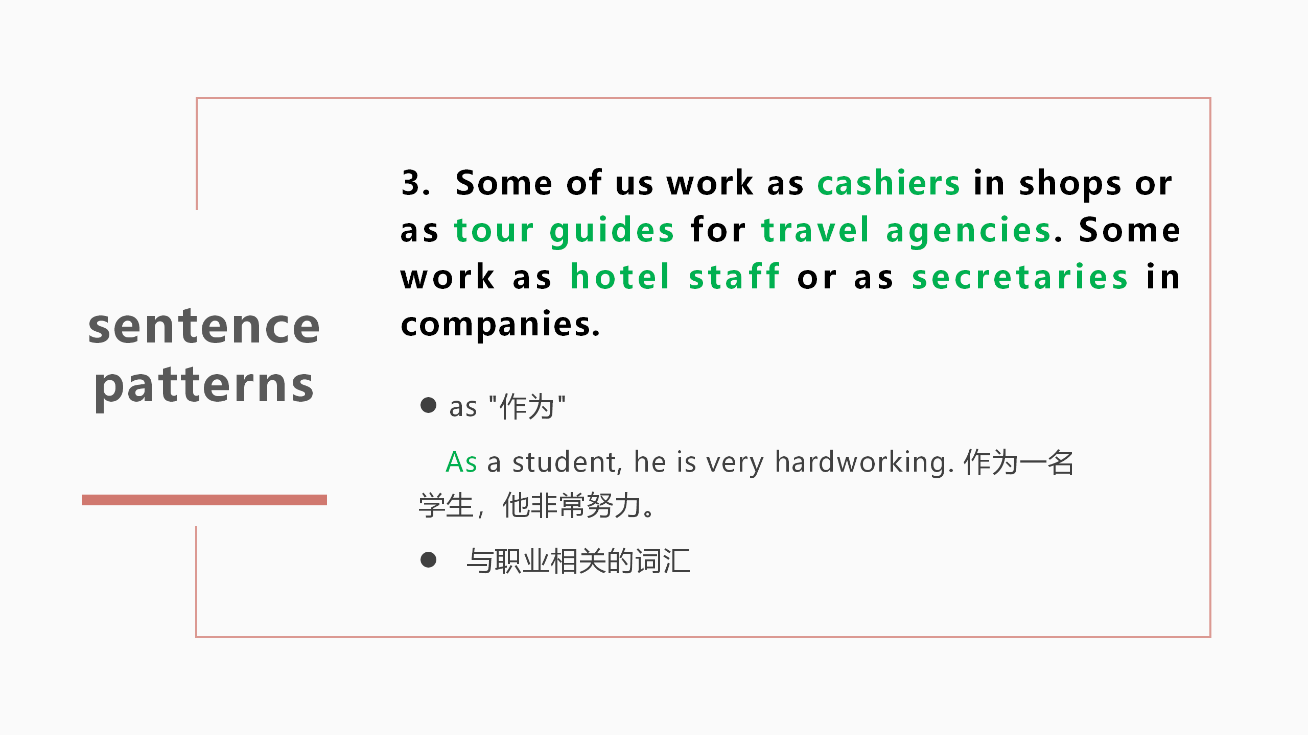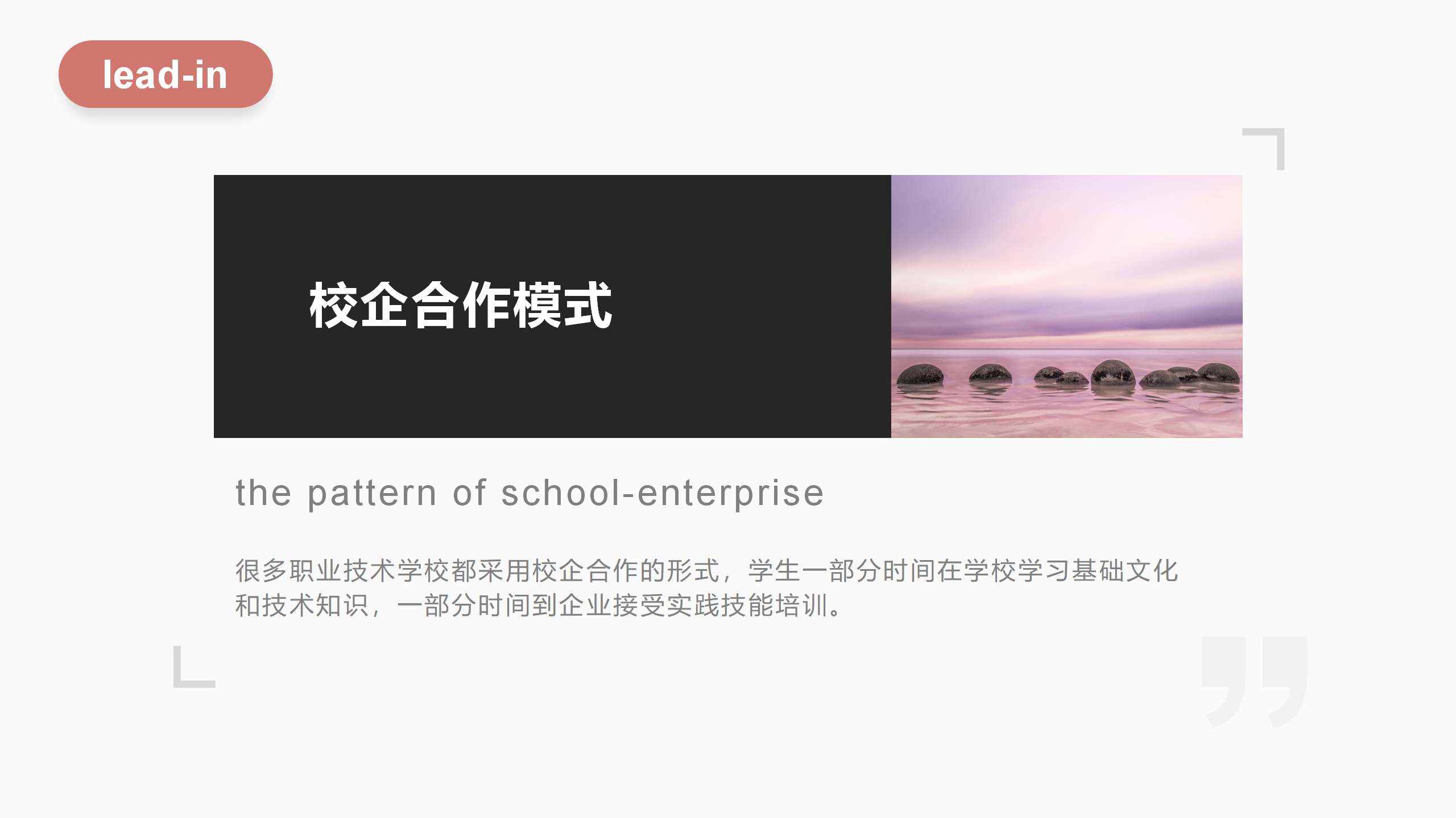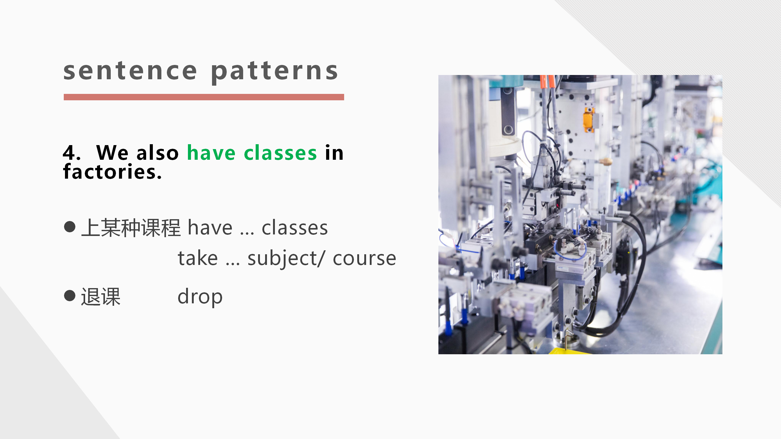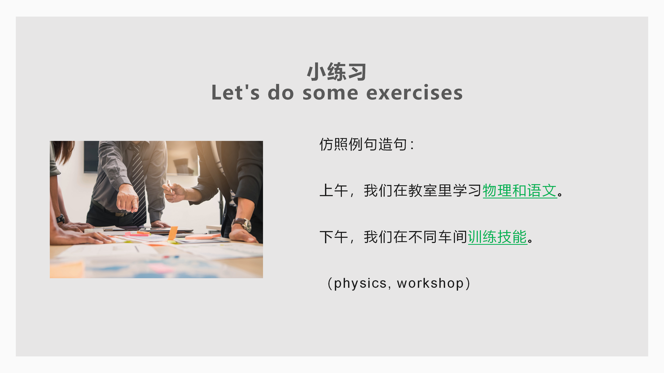 I am studying at a vocational school now. In the morning, we study English and maths in the classroom. In the afternoon, we do skills training in different places. Some of us work as cashiers in shops or as tour guides for travel agencies. Some work as hotel staff or as secretaries in companies. We also have classes in factories. The workers there show us how to use the modern machines. It’s quite interesting.