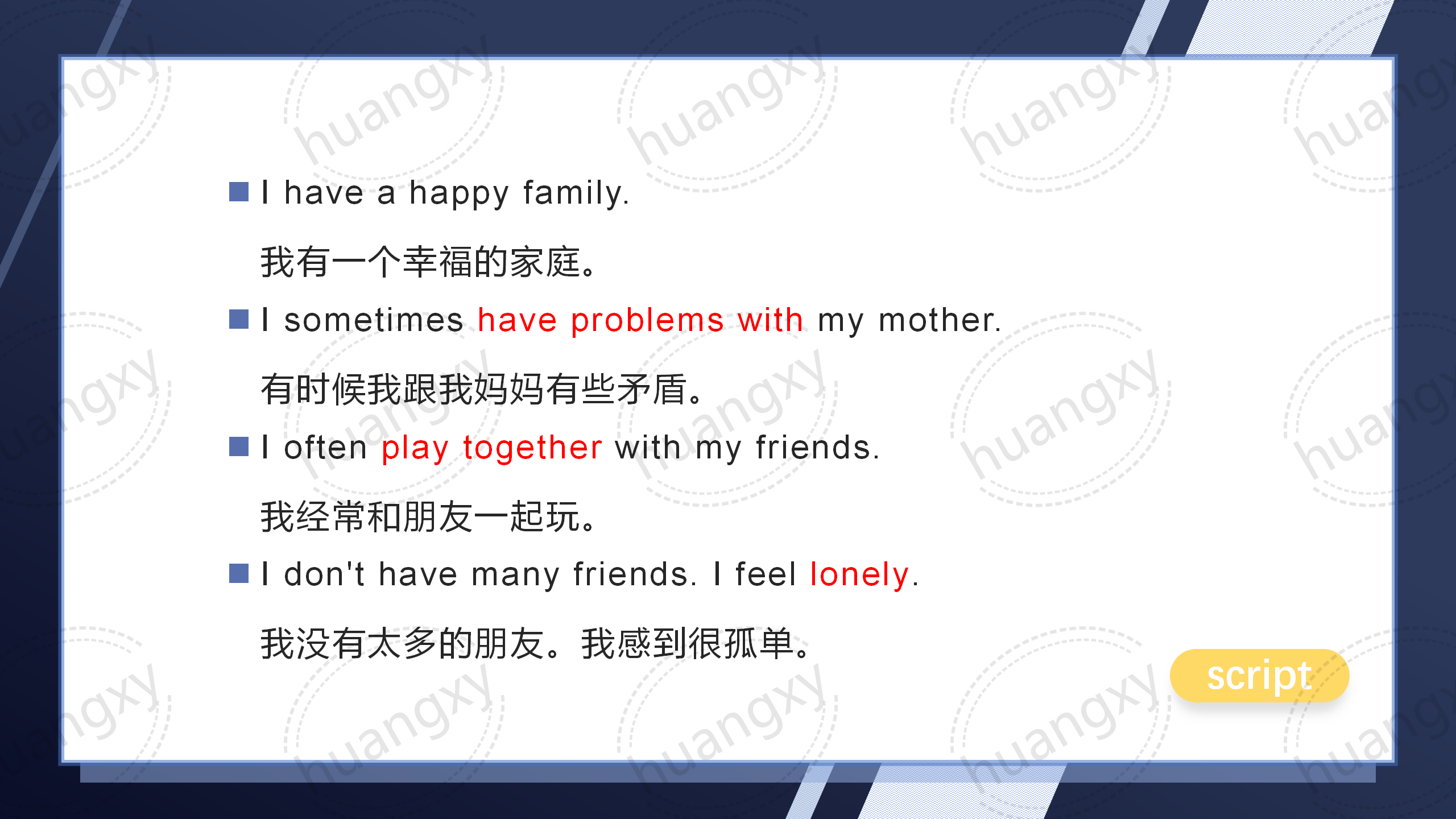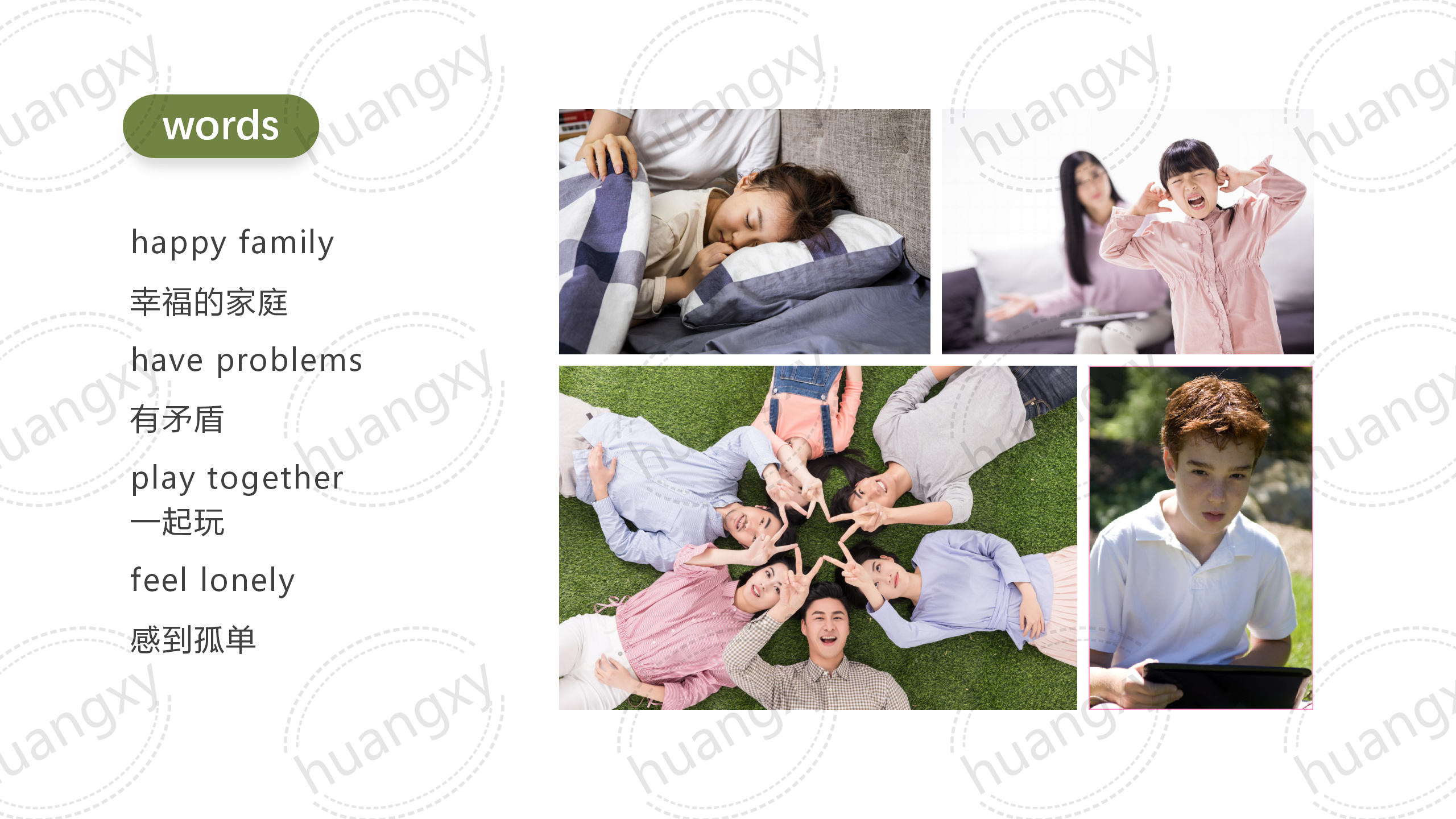设计目的 本版块旨在通过听录音和看图两种方式,帮助学生回忆起描述人物性格、家庭关系和朋友关系的词汇和句子。