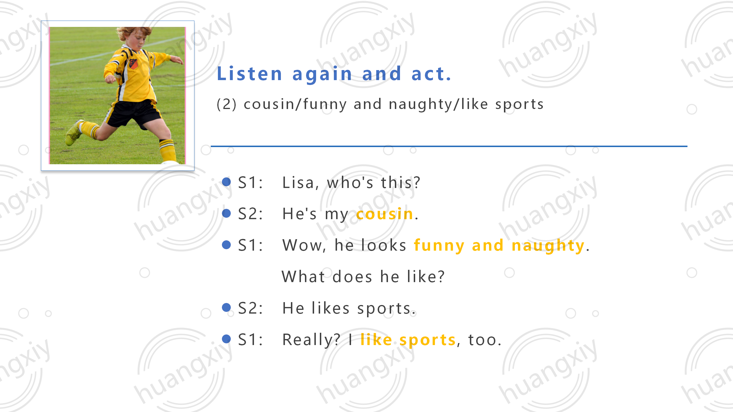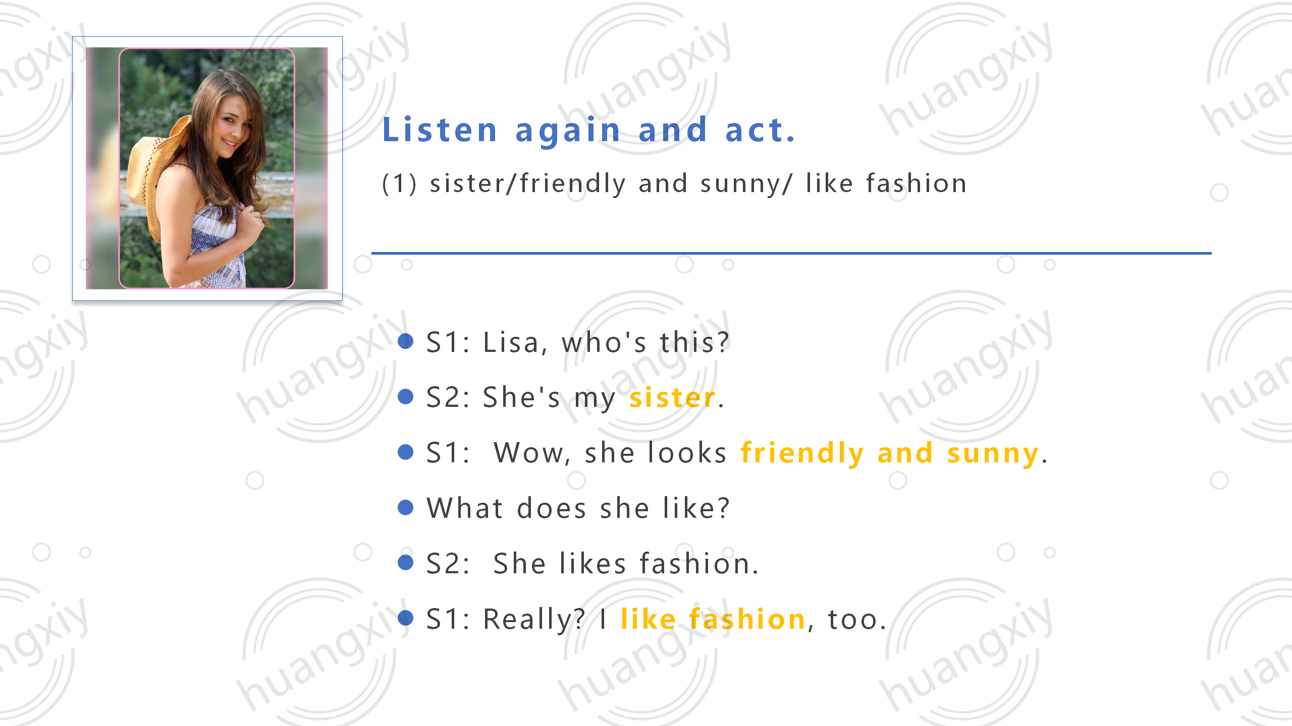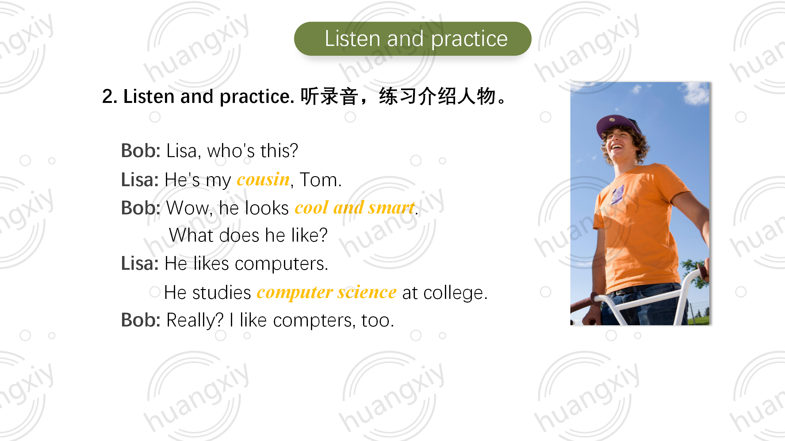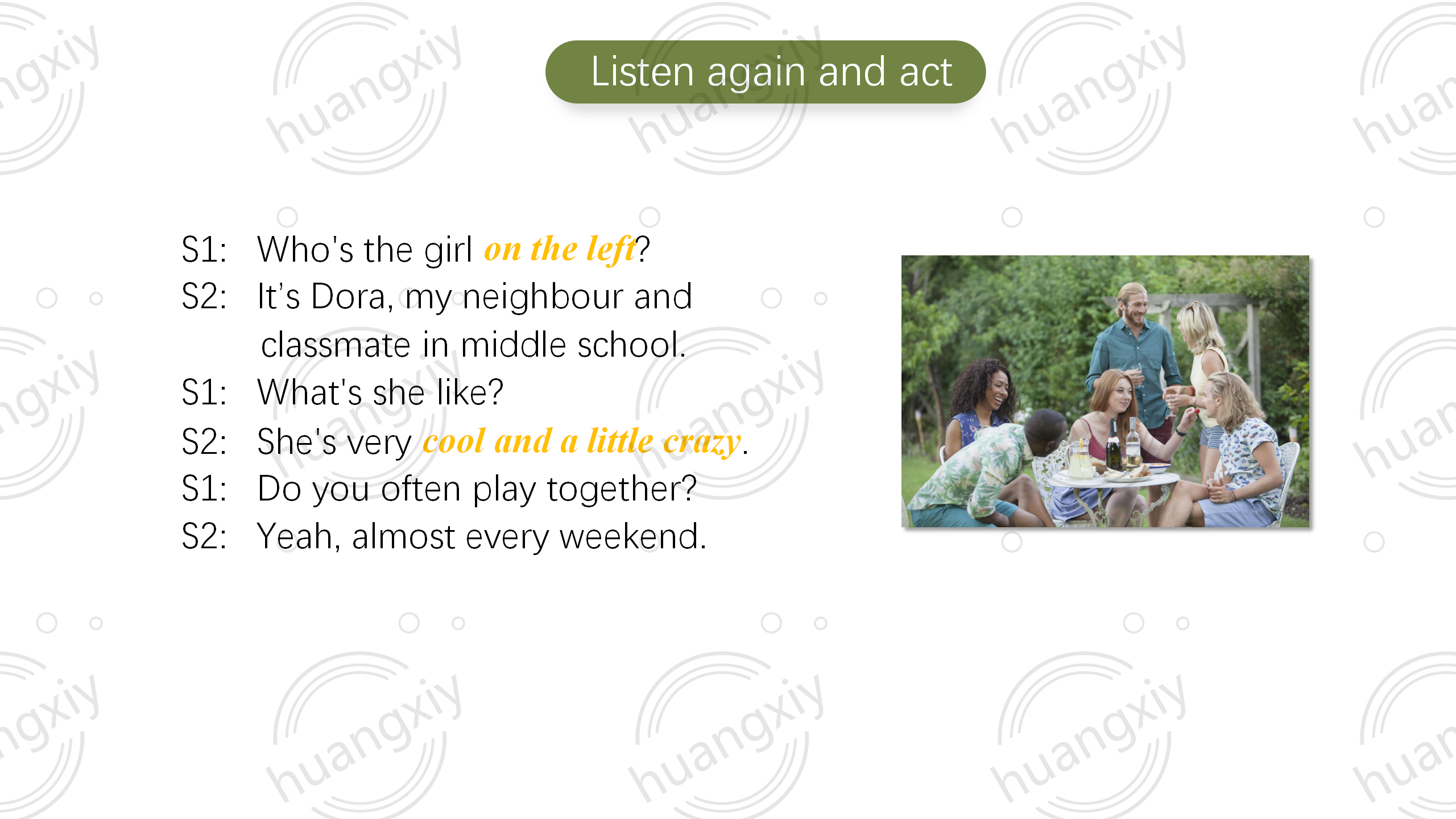 5. Listen again and act. 再听录音,根据提示讨论照片中的其他人。