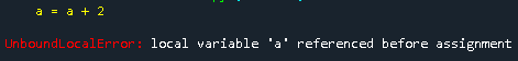 a = a + 2 # 错误语句! 右面的a是本地变量,还没有定义,竟然被引用啦?