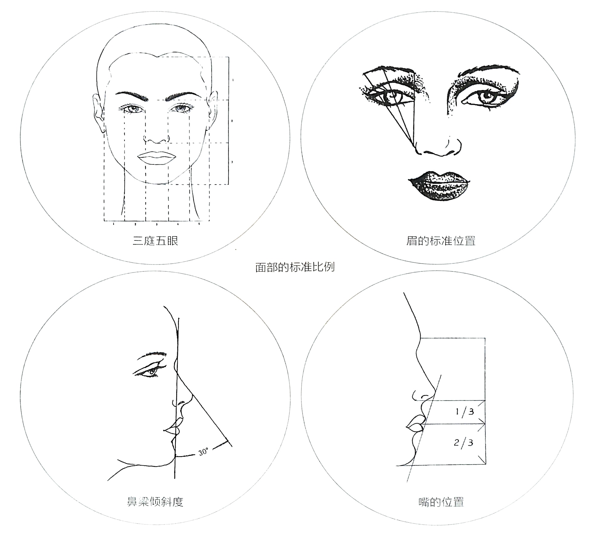 谈到面部标准比例关系,中国古代画界画人像时总结出的"三庭五眼" 这一精辟概念,为化妆造型提供了依据和方法。面部的标准比例可以从以下几万面进行阐释。