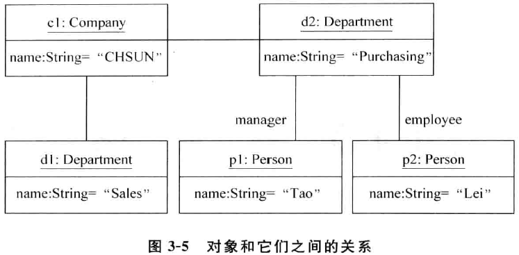 有的时候仅表示对象 本身并不重要 ,更多时候,需 要表达对象之间在系统的某一个特定的运行时刻是如何 在一起工作的,这就需 要展示对象之间的关系。对象图用链将这些对象捆绑在一起,U ML 将其称为 Li nk ,即链。UM L 用实线表示链,如图 3-5 所示 ,在链上可以加一个标签表示此链接的目的,如 m a na g e r和 e m p l o y e e ,标签是可选的。