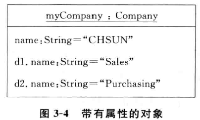 at t ri b u t e s na m e 是属性的名字,t y p e 表示属性的类型,va l ue 是属性的状态值。图 3-4 给出 了类 C o m pa n y 的对象 m yC o m pa n y 及其属性 。