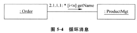 在通信图中,循环用“*”号来表示,循环子句被放在顺序号的后面,表示循环将按 照给定的循环子句重复。如图5-4中消息 2. 1. 1. 1 * [i< n] getName就是一个表示循环的例子,其中,*[飞 n]表示消息 getName在 I小 于 n的时候将被重复发送。如果仅想表示循环,并不想 说 明 循 环的细节,则只 加“ *”号 就 可以了。
