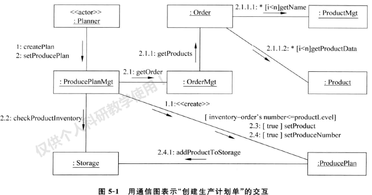 顺序号常用在通信图中,因 为它们是说明消息相对顺序的唯一方法。图 5-1 中 1: createPla n、2 : set P rod u ce P la n 等都是消息的例子。