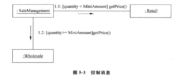 图 5-3 的例子展示了控制消息对基千特定条件的消息发送的选择,它 表示当 1. 1 中控制条件 q ua n tit y< M in iA m o un t 为真的时候,S a le M a nag ement 将向 Reta il 发送消息 ge t P ri ce ( ) ,否 则,S a le M a nag eme nt 向W ho les ale 发送消息ge tP ric e O 。