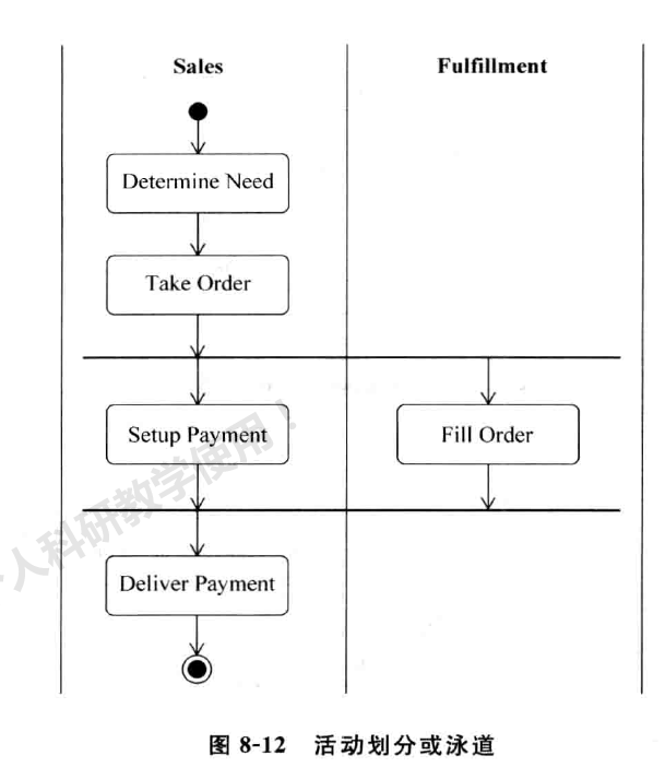 活动划分将一个活动图中的活动元素分组,每一组的上方表明该组元素所属对 象,这样 很 容 易 通过划分看到活动的参与者。图 8-12 用 于表示一般销售流程中业务用例的活动过程。其中,S a le s 和 F u lf i ll m e n t 分 别 是活动的参与者,第 一 个 泳道中的内容都是 S a l e s 对象的活动 ,而活 动 F ill O r d e r 则 属于 F u lf ill m e n t 对象的活动 。