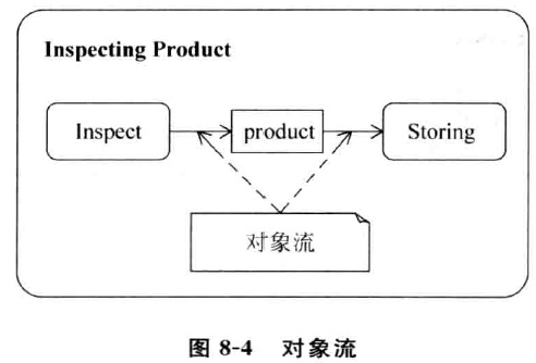 当活动边连接动作与数值或活动与数值时,UML 2. O 称这类活动边为对象流(ObjectFlow ) ,对象 流用于描述活动中的数据输出输入。如图8-4所示,对象p roduct 表示的是一个数据包,它是动作 Inspect的输出,是动作 Storing的输入值。