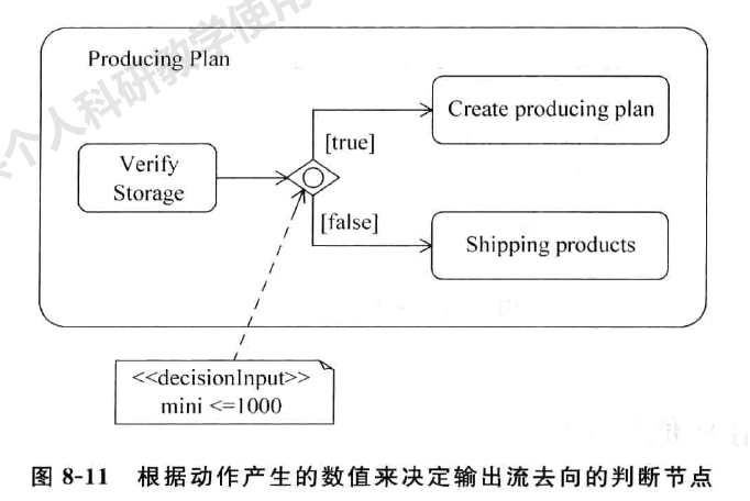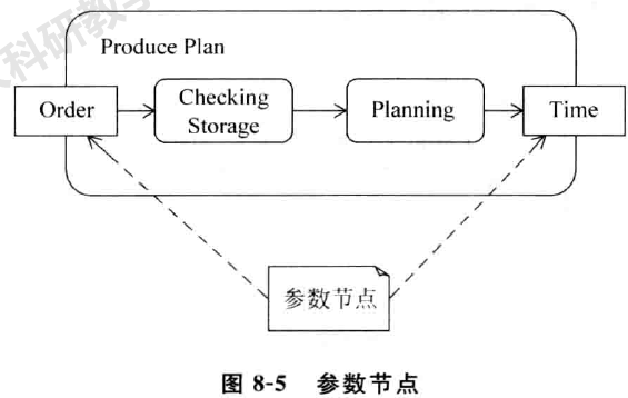 UML 2. 0 用参数节点(Parameter Node ) 来表示一个参数进入一个活动或者一个参数从一个活动中输出。参数节点用一个直角的长方形来表示。如图8-5所示,活动ProducePla n 内有两个动作,它们 分 别 是 Checking Storage 和 Plann ing。