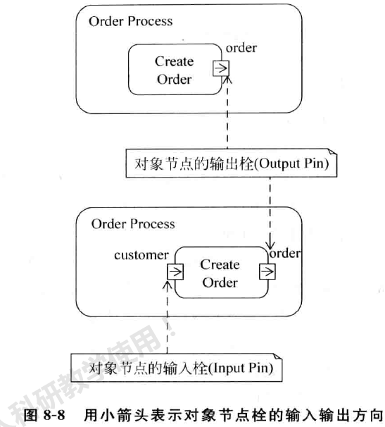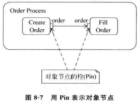 当不知道动作输出的对象节点的去向,或者不知道动作输入的对象节点的来源 时,UML2. O用 一个小箭头标志在对象节点的栓的小方块中来表示该对象节点的输入栓( InputPin ) 和输出栓( OutputPin) 。例如,在图 8-8中,动作 CreateOrder分别标有输入栓和输出栓。