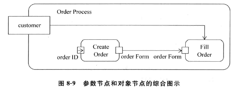 图 8- 6与图 8-7均表示活动 CreateOrder产生了对象 order,而对象 order将作为一个参数传递给活动 FillOrder。CreateOrder可以是某个类的方法,在 CreateOrder中可以包含下面的代码:O rder o = new Order()。