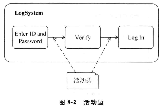 在活动图中,仅有动作是没有意义的,因为活动图需要表现动作与动作之间、动作与数据之间、数据与动作之间的关联和方向。UML2.0称这些出现在活动中的信息之间的关联为活动边( ActivityE dge ) ,如图 8- 2所示。