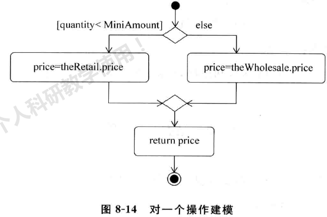活动图 用于对活动过 程和操作建 模。当一个操作很复杂时 ,可以 用活动图来 表达这个操作。向一个操作添加一个活动图 是最常见的,此时,活动图 只是一个操作的动作的流程图 ,它更多地展示了关于操 作算法的一些信息。图 8-14 给出 了根据订单中预订产品的数量来计算产品价格的操作活动图 。