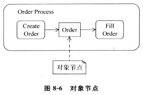 现在已经学习了几种对象节点的不同表示方法,图 8-9是一个综合所有对象节点表现形式的图例。在图 8- 9中,注意,活动Orde rActivit y包括两个动作: C reat e