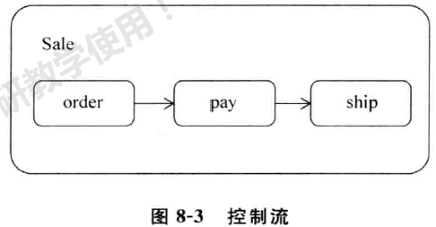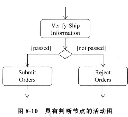 当活动边连接的是两个动作时,这种活动边称为控制流( Co nt ro l F low ) 。控制流一般发生在两种情况: 在活动边控制下,活动由一个动作直接转变为另一个动作时, 或者由一个动作经过一个逻辑判断条件转变为另一个动作时。表示控制流的活动边的箭头指明下一个动作,如图 8-3 所示。