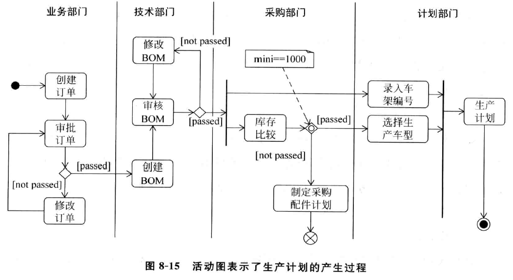 再来看一个为活 动建模的例子 ,以 PPS 项目的关千生产计划制定 过程的活动图。此时,活动图用 于为企业业务活动建模(图_8 - 1 5) ,它的事件 流描述 如下: