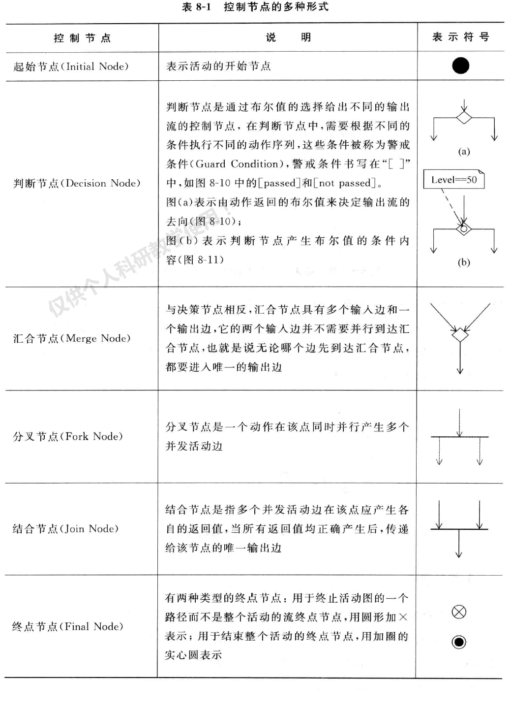 控制节点( ControlNode ) 是用于表示活动中的控制判断、同步运算、路径分叉、路径合并 等特殊节点。控制 节点 主要 包括起始 节点 (In山alNode汃 判 断节点(DecisionNode) 、汇合节点 ( MergeNode ) 、分叉 节点 (ForkNode ) 、结合 节点 (JoinNode) 以及终点节点( FinalNode) ,如 表 8-1所示。